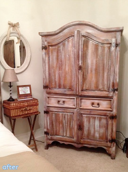 Eden reports that this entire makeover was done for about $350, with the headboard costing $120 of that. Most everything else was Craigslist, thrifted, or homemade, including this nifty armoire makeover.