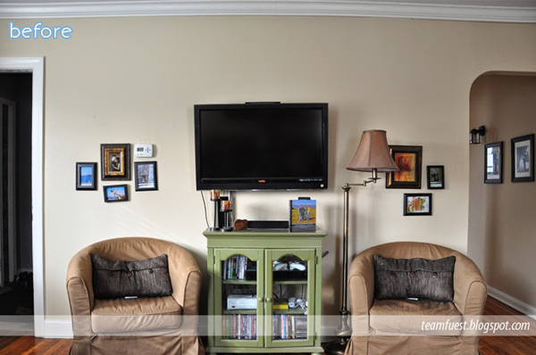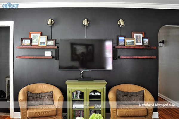 Oh, awkward TV, what are we going to do with you? There’s just no hiding that big black eye smack-dab in the middle of the wall. We could stuff you in an armoire … but that negates the point of having a flat-screen. Hmmm. We could stop watching TV altogether … but how would we know what Gwen Stefani wore on The Voice? No no, there has to be a better way.