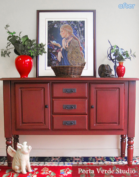 Jacqui at Porta Verde Studio updated this nondescript buffet with a new set of handle much more suited to the piece and a little romantic red.