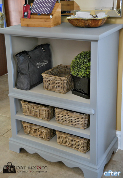 In this case, ‘life’ was her step-dad who discovered this perfectly fine and functional piece sitting at the curb on garbage day. Shelly decided that she’d turn it into a drop-spot: a place to stash purses and backpacks, store hats and gloves, hold keys and mail, and even thrown in a phone charging station. That’s a lot of function, and all for free!