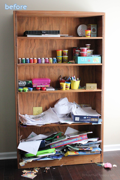Erin at DIY on the Cheap gave this tired bookcase a fresh look with paint and removable wallpaper. Straightening up and styling go a long way too. I try my darnedest to keep my daughter’s bookcase neat and pretty, but she’d rather use it to display her collection of chapstick lids and crumpled paper. And single earrings. And plastic cupcake toppers. And broken pencils. Sigh.