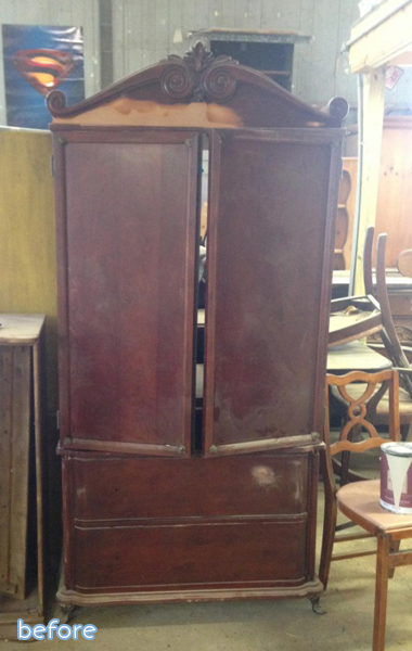 And another one from Sarah, who comes to you with open armoires. She removed the doors of this piece so it could serve as a display area. Fun fact: the backing of the cabinet is actually wood flooring. Smart!