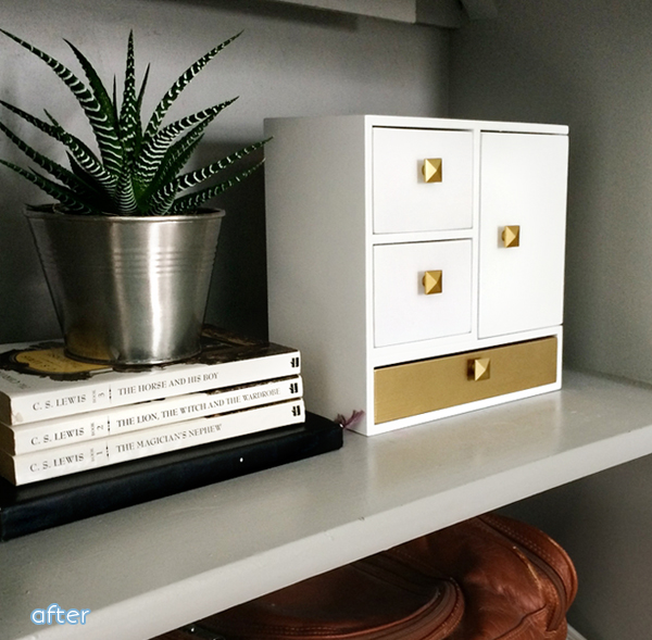 And speaking of white and gold, which is apparently my love language, Joy at Beautiful Protest dolled up this itsy-bitsy jewelry box, and it looks so chic on her shelf now! Chic on a Shelf just so happens to be the name of the e-book I’m writing; a definitive how-to guide on decorating shelves. I’m not really doing that, but don’t copy my idea just in case I ever do.