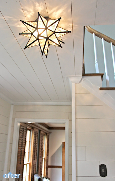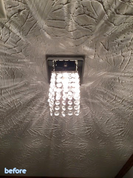 March 12, 2015 at 12:03 PMSuch a nice update! The ceiling “before” looks like a frosted cupcake! The planking adds such warmth and the light fixture adds a fun, sparkly twist.