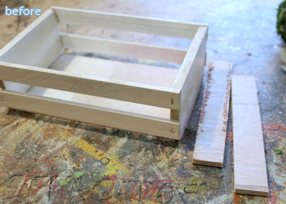 A simple crate, wood strips, and wire is all it takes. Stuff it with some fake grass and you’re practically done. Just kidding. I actually don’t condone using fake grass. You will be cleaning it up until Christmas, trust me on that.