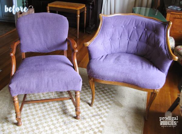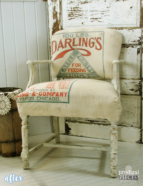 I’ll tell you one thing it’s not good for. Upholstery. That’s a firm NO SIR. But that didn’t stop someone from using it to reupholster this poor pair of chairs at some point in time. Larissa at Prodigal Pieces reports they were so scratchy and uncomfortable, no one in her home could bear to sit in them.