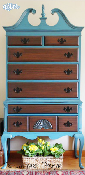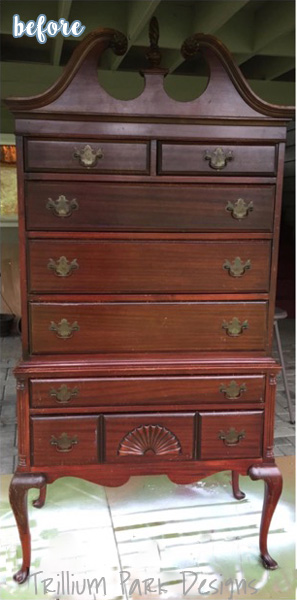 This highboy looks to be a remnant of those Bombay glory days, but today’s styles seem to lean a bit lighter and brighter, so Jennifer at Trillium Park Designs brought it up to speed with just a little paint and glaze.