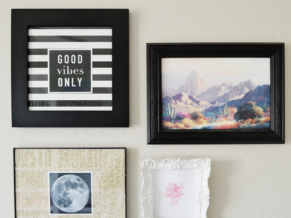 I have a few homages to Arizona, with this painting I found at the thrift-store and that little cactus print in the white frame. And also some good vibes. And the moon. Why not.
