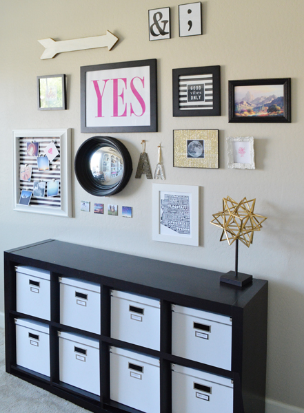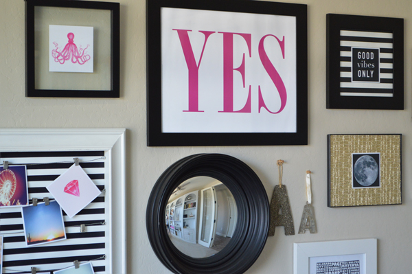 The number two rule of gallery walls is to keep it cohesive. I used a lot of black, white, gold and pink to tie the randomness together.
