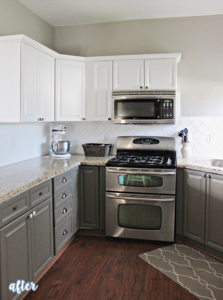 Of course, once she painted the cabinets white, the beige-y backsplash had to get a makeover too, and she also decided that she would incorporate more of the countertop color by doing gray paint on the bottom, and I made most of this story up, but I’m sure it probably happened pretty much just like that.