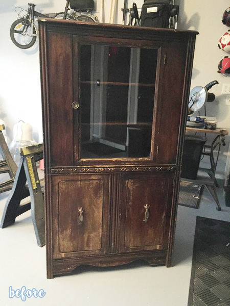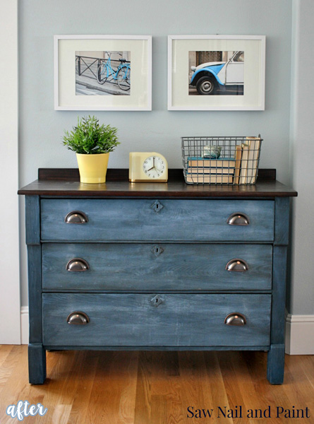 She tamed it with milk paint and stain and a shiny new set of cup pulls, and it’s gorgeous! She says the paint gave it a look of ‘washed denim,’ which looks like a perfect description to me. See it on Susan’s blog Saw Nail and Paint.