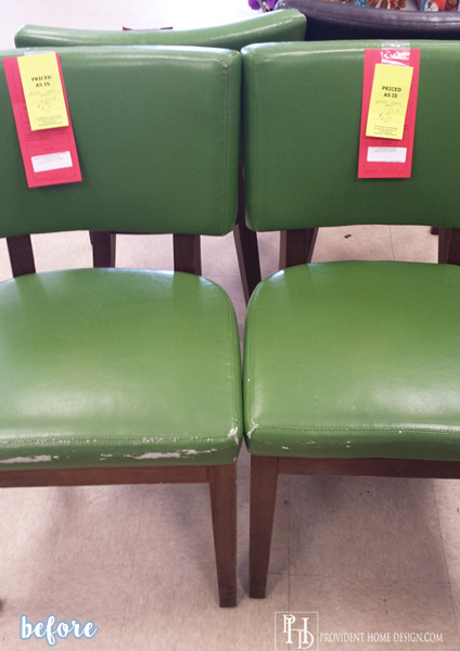 Tamara scored with a pair of $6.50 thrift store chairs that she recovered with about $8 worth of fabric. (Tip from Tamara: most fabrics sold from online fabric retailers can also be found on Amazon, where she saved a bundle on shipping).
