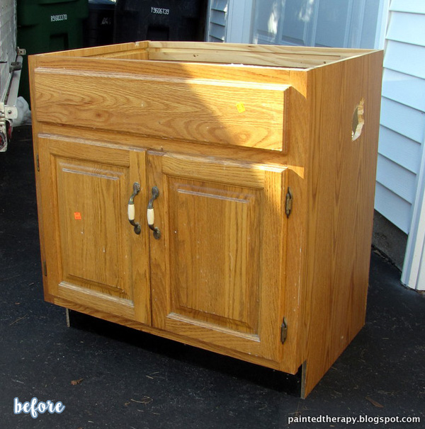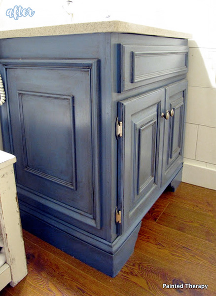 OK. So take your builder-grade cabinet and as many fingers as you’ve got, and get your little hands to work! Check out what Debbie did to this worn out and basic bathroom vanity: