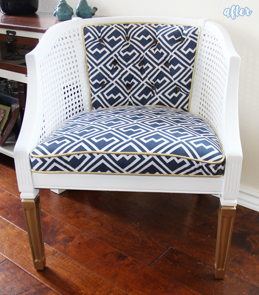 Beck at Beckwith’s Treasures went for the heart-fluttering combo of blue, white, and gold when she redid this chair and it looks fabulous.