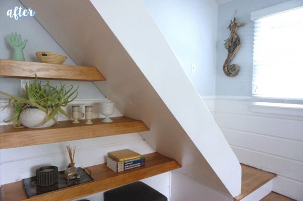 One last thing Malorie wanted to give her mom was more storage, since this room is not super huge. Vito utilized this empty space under the stairs by adding floating shelves.