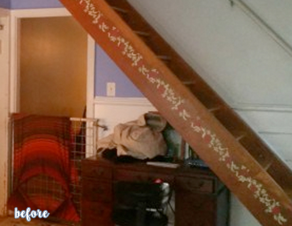 October 30, 2015 at 7:12 PMI like the before too, but I agree the after is way better. I’ve been struggling with trying to figure out what’s not working in my house. I have a lot of things I like, but they don’t necessarily go together. In these pictures, I see walls I like, a chair I like, and a cool vintage flower stencil on some pretty wood stairs, but they’re not working together at all. The simplified, clean-lined update totally works! 🙂