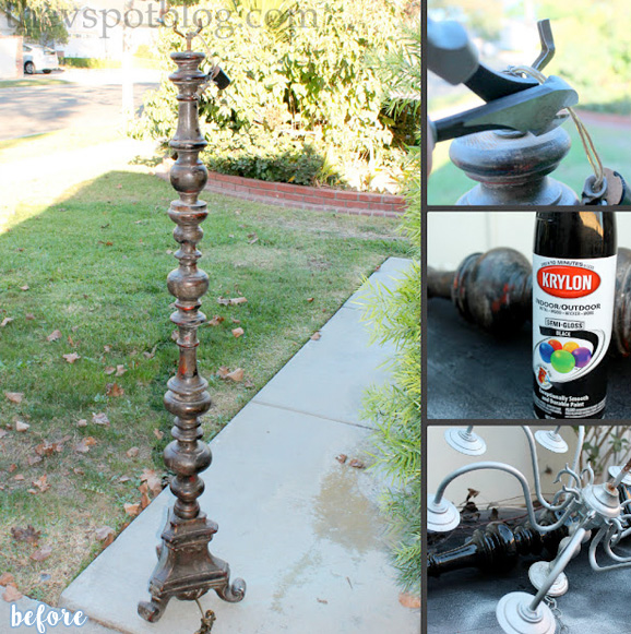 Are you ready for one more? You are a DIY Halloween expert by now, so of course you are. Ok. Head back to the thrift store. Get your grubby hands on an old floor lamp. It doesn’t need to be in working order, we just want the base, so the more ornate the better. Fingers crossed that there is also an old chandelier there that you can toss in your cart – again, no need for it to be functioning.
