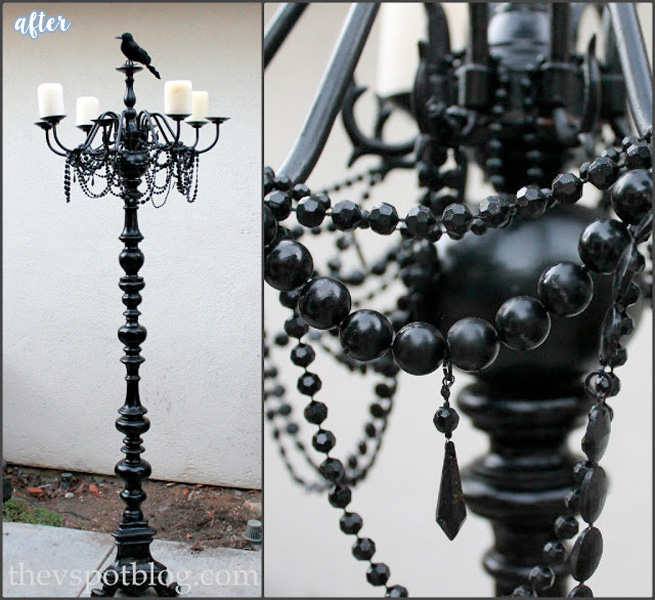 Vivienne had her husband insert a metal rod into the top of the lamp, then attached the chandelier to that to keep it securely in place. She spray painted everything black, then draped it in black plastic beads and topped it off with a faux crow, or a real crow who has excellent timing. It could happen.