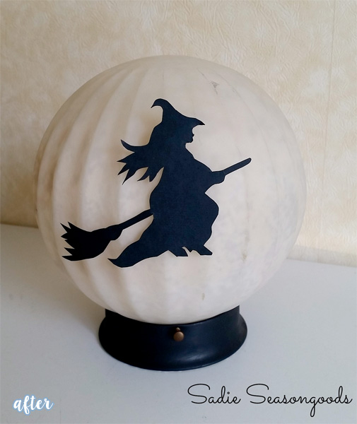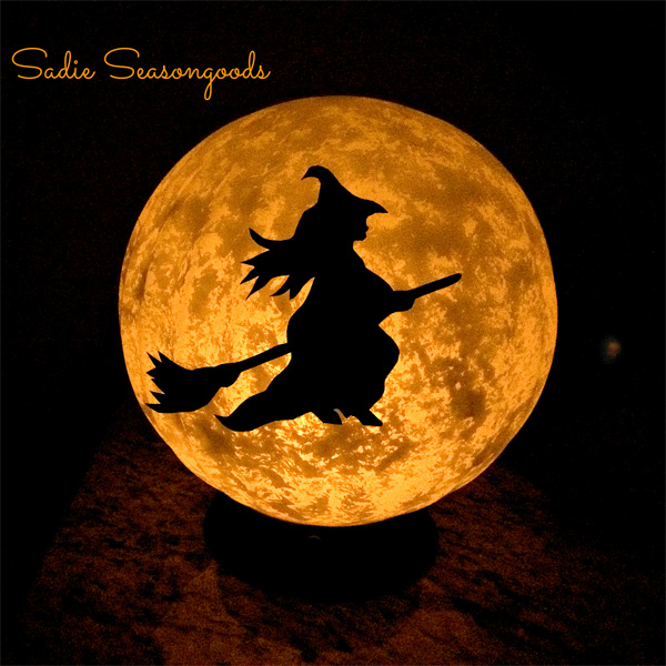 Now you’re ready for a bit more of an advanced project. This time, look for an old globe light fixture. These are usually plentiful at my local ReStore, so that’s a good place to check. Spray paint the base black, and sponge paint the inside of the globe. Cut a witch silhouette out of black paper and tape it on. You’ve made …