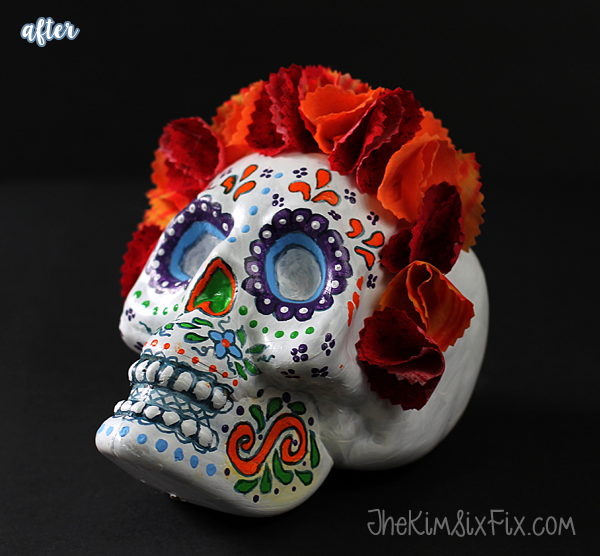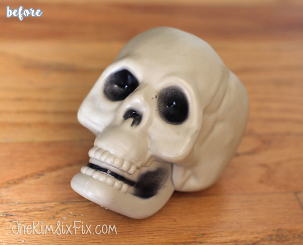 And what could be cheaper than the dollar store? Not much, unless there is a 50 cent store somewhere I don’t know about. But anyway, that’s where Kim picked up this plastic skull and decided to give it some help in the looks department.