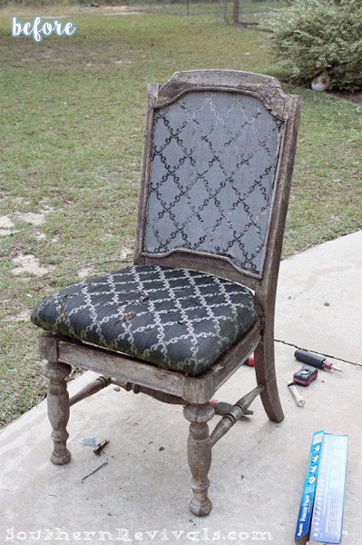 But it turns out that battered and weather-beaten is the perfect condition for a spooky seasonal skeleton chair! It looks amazing! Wondering how she applied that skull graphic to her fabric? Find out at Southern Revivals.