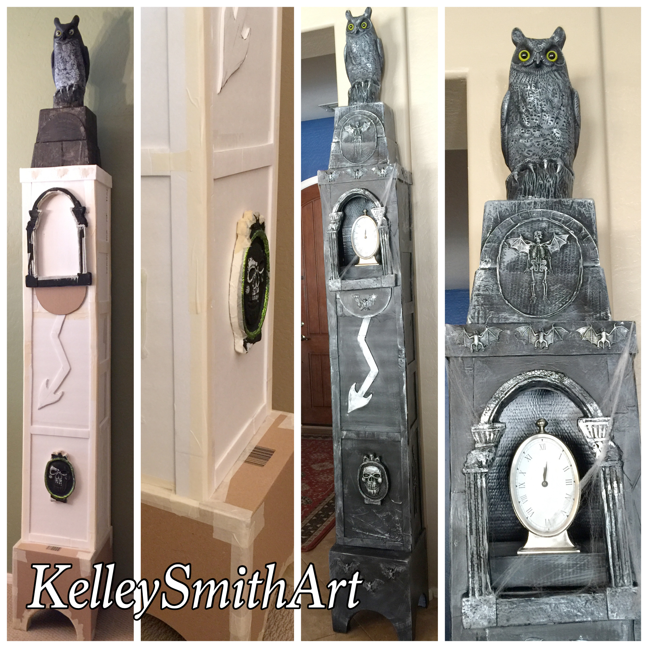 She said “It’s a little wonky but mistakes can become happy accidents especially if it’s a Halloween object. The owl and its styrofoam cooler base are from the dollar store, so are the embellishments. I cut apart a $1 gravestone to make the arch. Time was really the most valuable thing that I spent on this, but it was fun!”