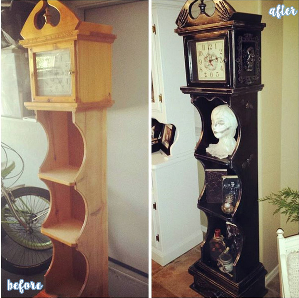 She says “I couldn’t find a toy skull or plastic skull I liked for the side detail, so I made those out of clay. The rest were dollar store goodies and cheap pressed wood frames. I removed the bottom and used it as trim on the front side to make it more interesting. And then spray painted the crap out of it, and rubbed silver paint on to age it. Not bad for $20 bucks at Goodwill and less than $5 at the dollar store.”