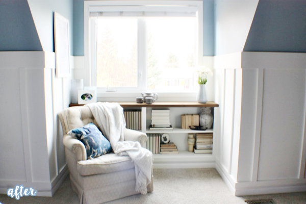 … I DO know that both Anna-Lisa and her husband are big readers, which is reflected now in their space thanks to this built-in bookshelf and other pieces of art Katie used around the room. You can see them all on her blog at Reclaiming Home. (Spoiler alert: one of them is the wreath over the bed made out of book pages!)