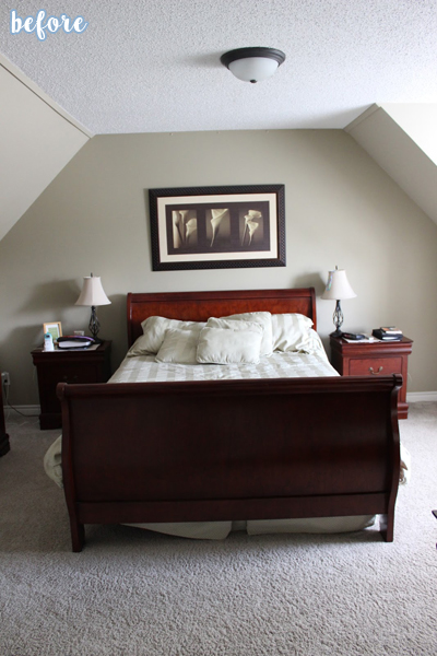 Espresso and oatmeal. Perfect for somebody’s breakfast. Rather un-exciting as a color scheme in a bedroom. I love me some neutrals, but this was neutral overload. The walls, bedspread, carpet, heck even the lampshades were all the same color, contrasted with heavy brown and nothing more.
