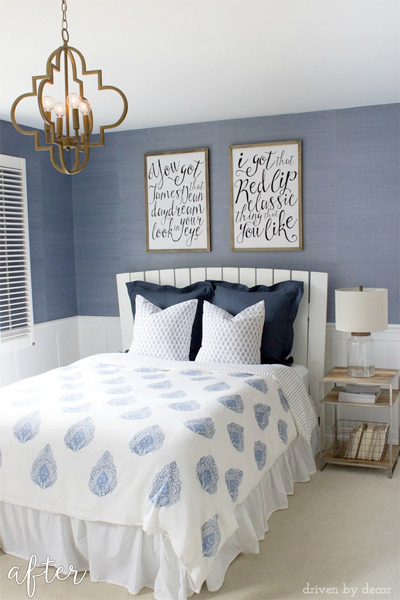 All you really need is a bit of color, contrast, and texture, like Katie gave the walls here with paint and wainscoting. She also used plaint white bedding, which sounds like the opposite of ‘adding personality’ but actually gives you more room to play with accessories and provides a sharper contrast to help the other objects in the room shine. And how about those faux beams?! I love how they tie in the dark furniture and make the room feel complete.
