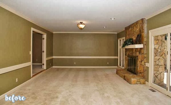 The wall color was one of the first things to go, along with the beige carpet and the monstrous stone fireplace. But don’t worry!