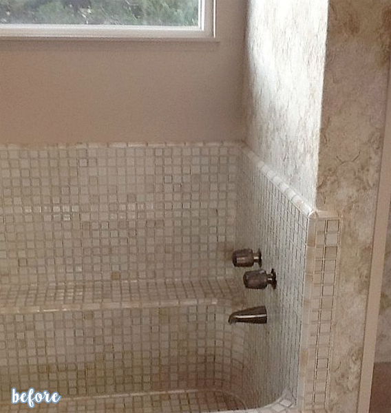 Tiles for miles! That’s what Corey was up against in this bathroom remodel she did for her aunt. Tons and tons of tiny one-inch tile. The shower was tiled, the tub was tiled, the weird little area in the corner of the two was tiled. Let’s talk about THAT for a second. What on earth?? I’m so curious what it was used for. I can’t even make a semi-plausible guess. It has a drain in it so … yeah I have nothing. Watering plants? Washing a dog? Literally there is no activity that would make sense in there.