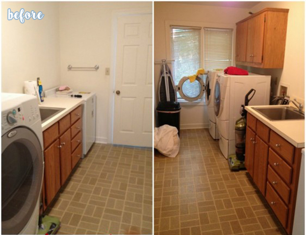I would trade my laundry room for Tasha’s before laundry room any day of the week, brown linoleum and all. Oh, to have a dedicated room to do laundry. My ‘laundry room’ is just a thoroughfare from the house into the garage, barely wider than a hallway, and impossible to pass through whenever anyone is attempting to do laundry. Heaven forbid someone enters the room while you are standing at the washing machine. You will get a door to the face. Or the butt, if you are standing at the dryer. Dumb, dumb, dumb. Whoever thought that through obviously has never done laundry, nor thought anything through.