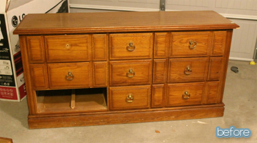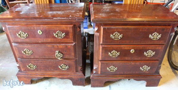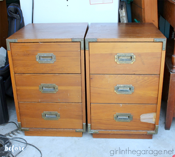 Last one from Jen at Girl In The Garage, who went to a ton of work to turn these hunks-o-junk into a Pottery-Barn-inspired pair. First she had to fix some major gouging in addition to removing the hardware and filling the holes they left behind too. Then she created entirely new hardware herself out of … can you guess?