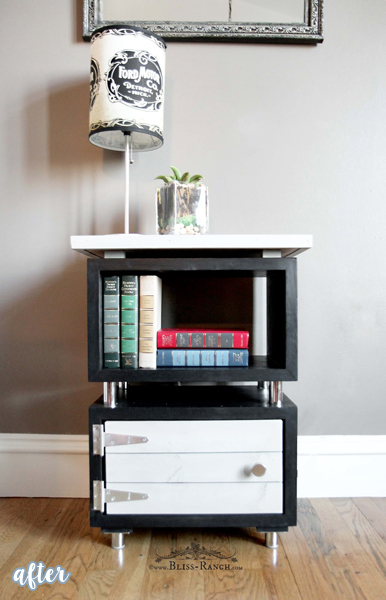 This nightstand was basically two boxes on top of each other, but now it is more, so much more! It has a new top and a door, some sweet hinges, and a black and white color scheme, which you can’t ever go wrong with.