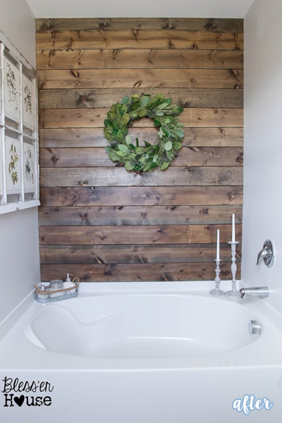 Not only is this rustic accent wall fabulous, the whole bathroom is filled with inventive and thrifty ideas. The shower doors are still my favorite bathroom hack of all time. Check it out here to relive them all!