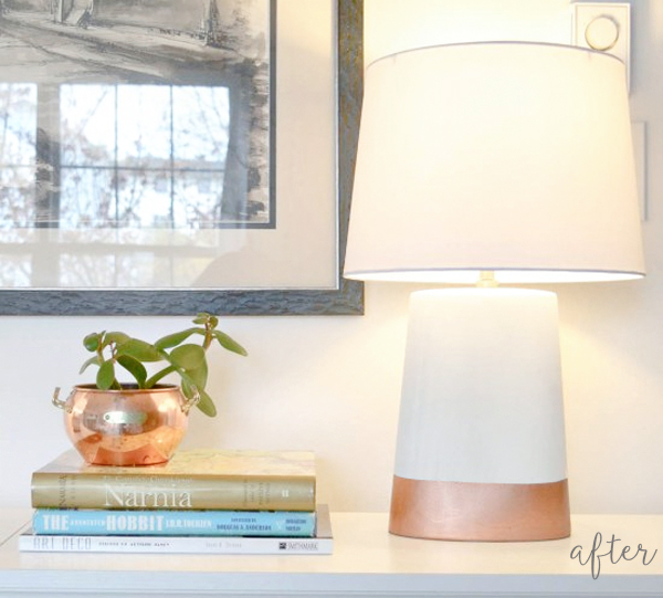 What about now? Copper and white spray paint for the win, plus an updated round shade! So much more appetizing. If you can call a lamp that. I say you can.