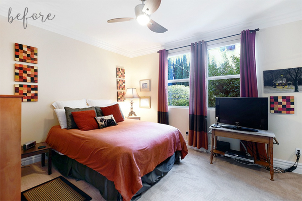 Superb! She did a great job paring it down to the basics and the result is so chic. There’s only one thing hanging on the wall now, as opposed to ten items in the before picture. I also love how the low bedside tables are not out of scale thanks to the oversize lamps. Smart combination there. And I love the striped benches, look how nicely she lined up the pattern. I just love the whole darn thing!