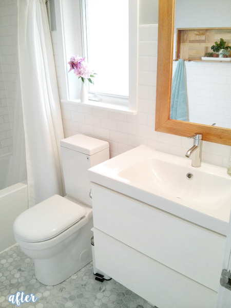 So she did! The paint was upgraded to a crisp white on the ceiling and a soft gray on the walls. New flooring and lights were the biggest changes, everything else boils down to accessories. Fantastic, and so doable! Sue accomplished this makeover in two days!