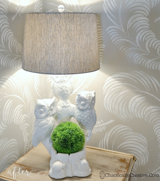 How about that? Paint, a nice shade, greenery and it’s a winner! White paint, you’ve done it again. Now the eyeballs are unnoticeable and the turtles are actually a cute detail. Speaking of details, I especially like the little crystal finial up top. Nice job Lesley!