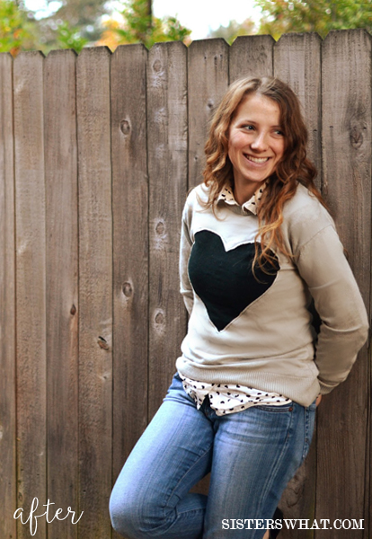 Anyway, let’s not lose that loving feeling. Let’s have a heart-filled reFashion Friday. It can be as easy as spicing up an old sweater with a giant heart.