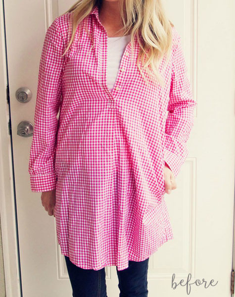 Let’s not neglect the boys. Let’s get the whole family in on our Valentine’s Day refashioning funtime! Kara found this pink gingham shirt at a thrift store and thought it would be perfect for her husband and two boys. Don’t believe me? Just watch…