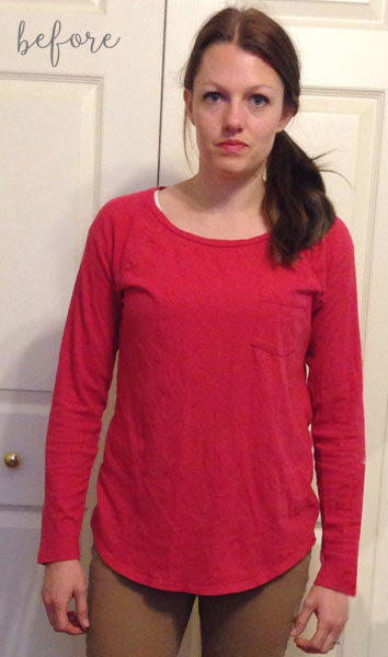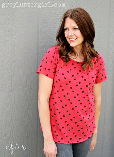 Literally, Lisa simply stenciled this heart pattern with a fabric pen! She also cut off the sleeves and left the edges raw for a no-sew makeover. That’s my kinda jam. See it at Grey Luster Girl.