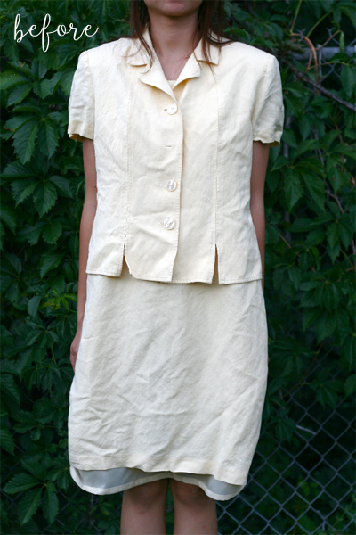1: Dye your dress. 2: Shorten the lining so it doesn’t show. 3: Cut the jacket apart and use the lower half to make a peplum. 4: Cut the jacket sleeves off and shorten them. 5: Sew the sleeves to the sleeveless underdress. 6: Alter the dress to be smaller and more form fitting.