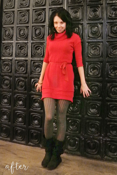 She was inspired to create a sweater dress after falling in love with a red one at BCBG Max Azria. The old sweater was a perfect starting point, but she was worried that she wouldn’t have enough material left over to make the skirt long enough. Luckily she did. It was obviously meant to be, and it looks nearly identical to the BCBG dress. It’s just that the BCBG dress came with one thing her version didn’t. A $378 pricetag!