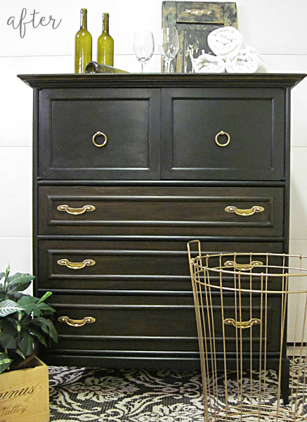 And for those of you who like your dresser makeovers dark and mysterious, check out this highboy that Vicki found at a thriftstore. It came with a mud-toned finish that she wasn’t wild about, so she sanded through it to the bare wood underneath.