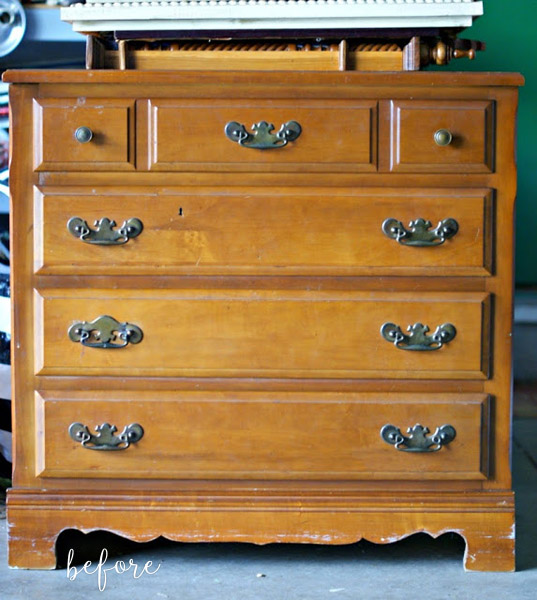 Have you ever wanted to try a furniture makeover but been put-off by the things that paint CAN’T solve? Like the faux drawers on this dresser? No matter how many coats of paint you slap on this baby, the top drawer is still going to try and convince people that it is actually made up of three smaller drawers. Not only is that look a bit outdated, it’s also dishonest! Stop lying to us, dresser!