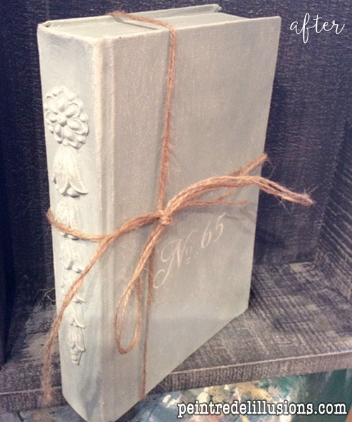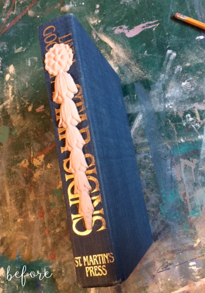 Johanne at Efex dressed up this book by gluing a wooden applique down the spine, then chalk-painting the whole thing.