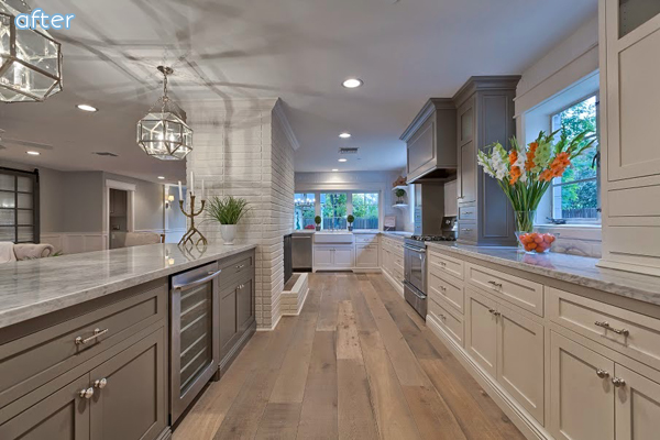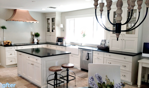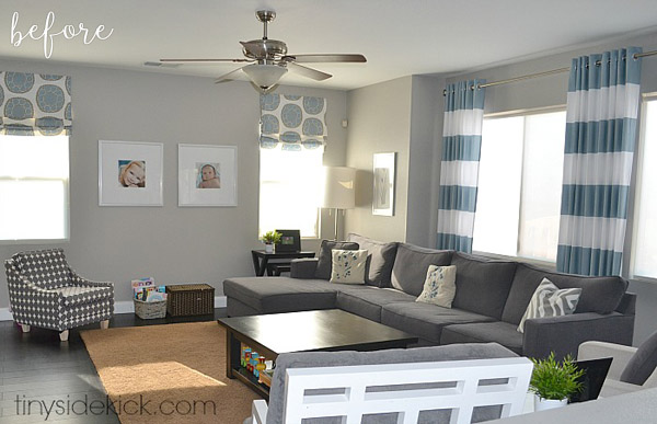 The after look still features those nice clean lines, just softened and brightened! The rug adds color and pattern, the coffee table is elegant and airy instead of boxy, and the splashes of color all around the room bring it to life.