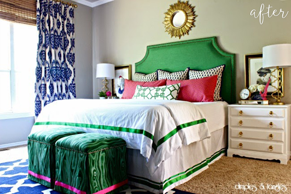 The ottomans did the trick, especially when trimmed in hot pink ribbon, and especially against the new bedding, rug, curtains, pillows, lamps, dressers, headboard, accessories and artwork. Whew! You know what they say though, sometimes you need to spend some cash to get some sass. Read all about this makeover right here on Dimples and Tangles.
